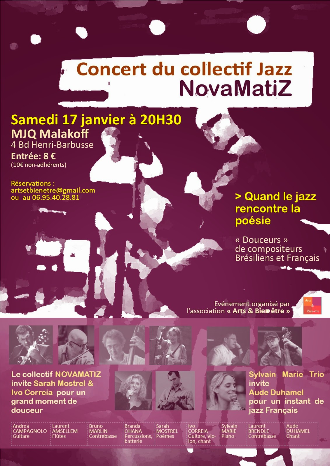 Arts & Bien-être invite le collectif NovaMatiZ et organise une grande soirée : “Quand le Jazz rencontre la poésie…”. Ce concert, autour du jazz mélodique, rejoindra une poésie musicale écrite ou adaptée pour l’occasion. La seconde partie sera consacrée en grande partie au Jazz Français.