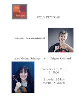 Le samedi 2 avril à 17 h, venez écouter le concert en appartement avec Brigitte Coissard et Mélissa Schneps, chez Isabelle Colombet 2 rue du 19 Mars à Malakoff (Métro : Ligne 13, Station : Malakoff – Etienne Dolet)